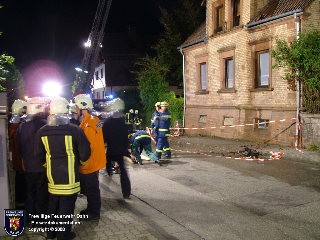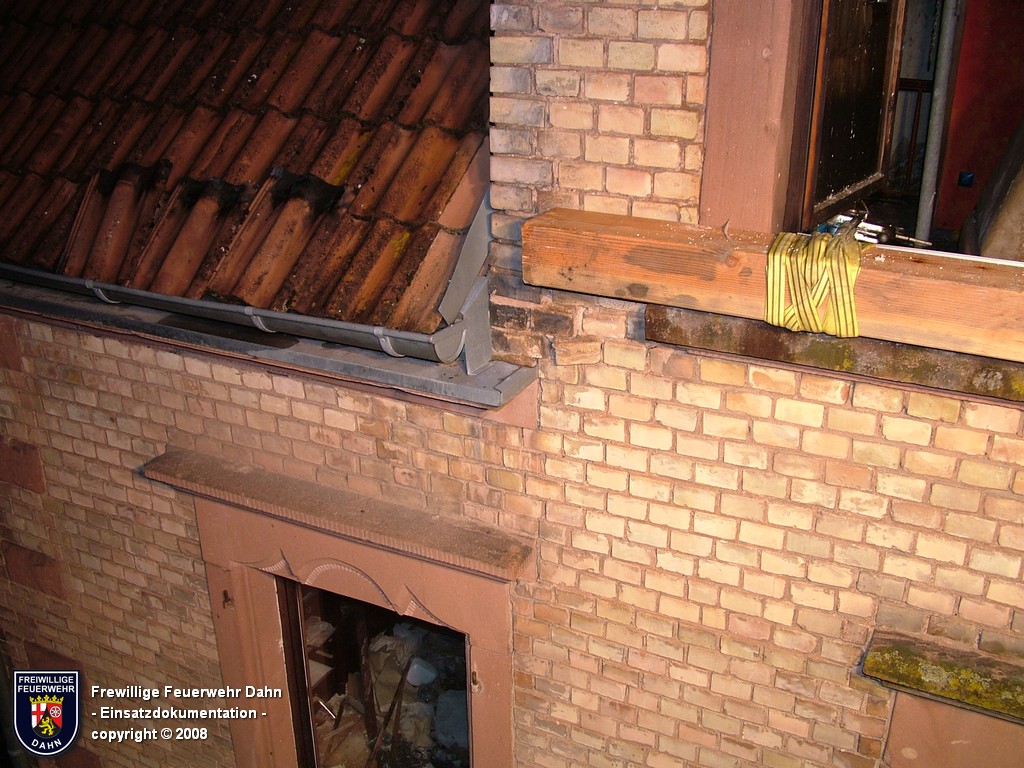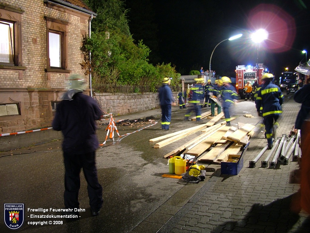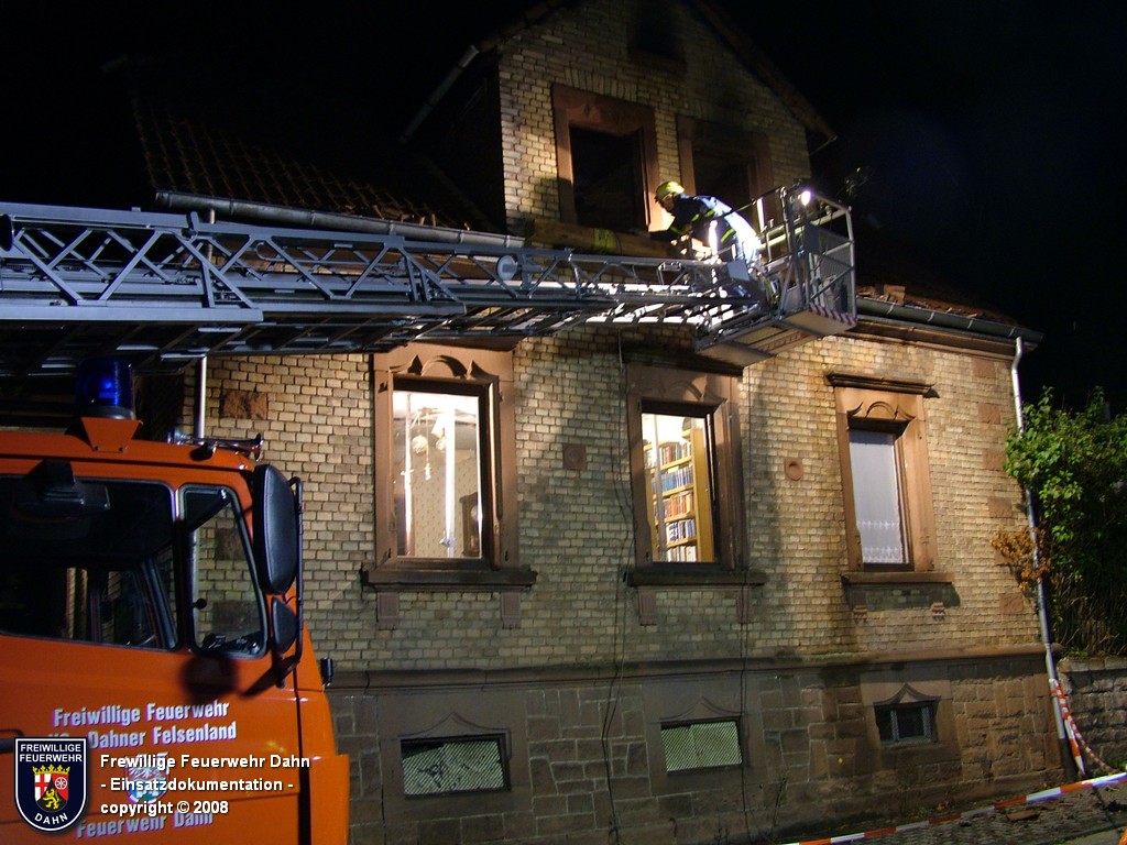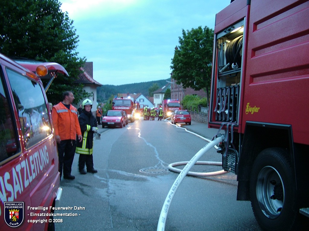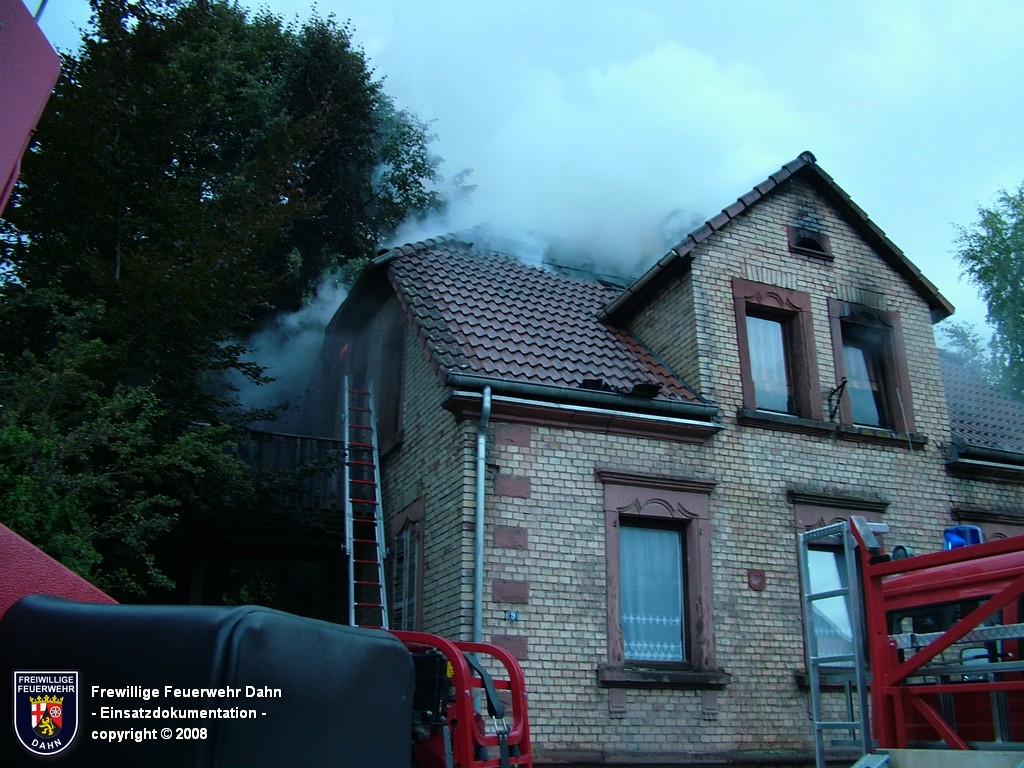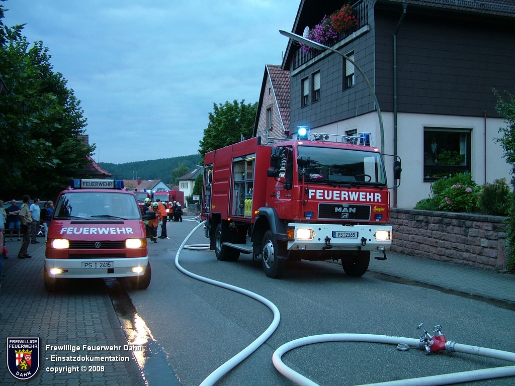 In den frühen Abendstunden alarmierte die Rettungsleitstelle in Landau die Feuerwehr Dahn zu einem Küchenbrand in Dahn mit dem Hinweis, die Bewohner wären noch im Gebäude und würden versuchen den Brand selbst zu löschen. Als die ersten Einsatzkräfte wenig später an der Einsatzstelle eintrafen, schlugen bereits meterhohe Flammen aus den Fenstern im 1. OG, noch vor Einleiten eines ersten Löschangriffes griff das Feuer auf den Dachstuhl des Gebäudes über. Zum Glück hatten alle Personen zu diesem Zeitpunkt das Haus bereits verlassen, so dass 2 Angriffstrupps unter Atemschutz in das Gebäude vordringen und den Brand sehr schnell unter Kontrolle bringen konnten. Das Feuer im Dachstuhlbereich wurde über das Wenderohr der Drehleiter abgelöscht, so dass die Nachlöscharbeiten durch weitere Atemschutztrupps durchgeführt werden konnten.