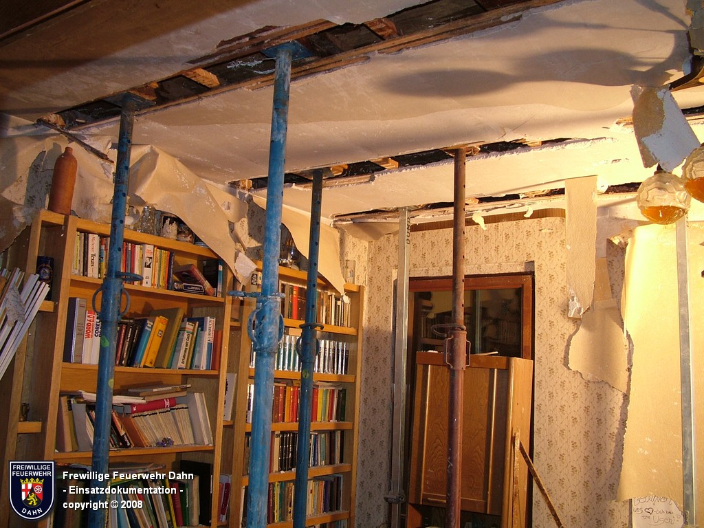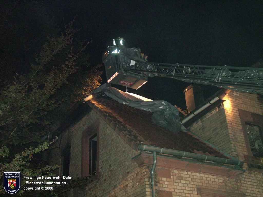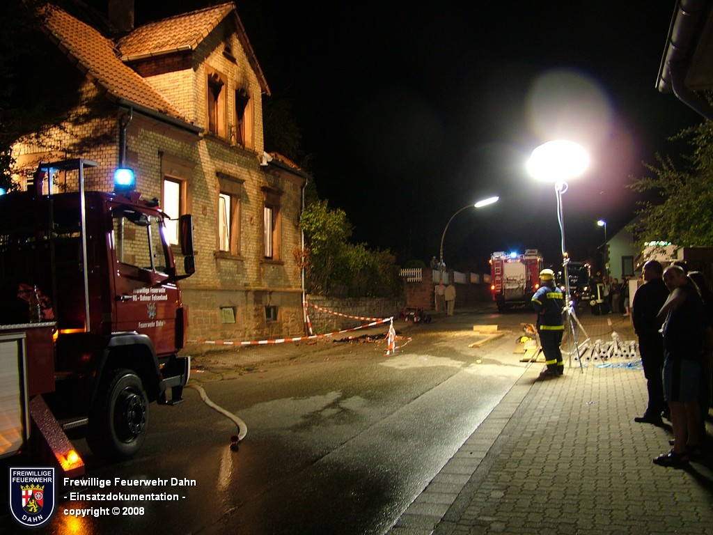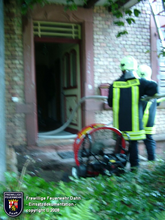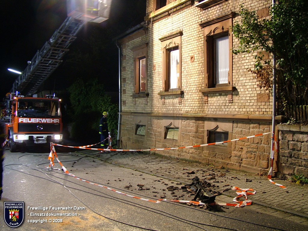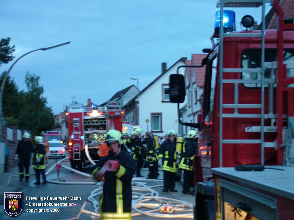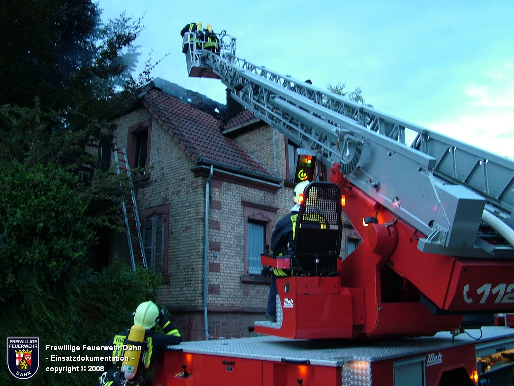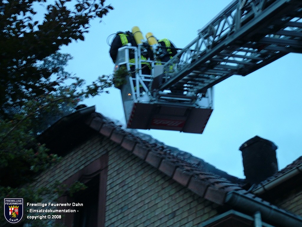 In den frühen Abendstunden alarmierte die Rettungsleitstelle in Landau die Feuerwehr Dahn zu einem Küchenbrand in Dahn mit dem Hinweis, die Bewohner wären noch im Gebäude und würden versuchen den Brand selbst zu löschen. Als die ersten Einsatzkräfte wenig später an der Einsatzstelle eintrafen, schlugen bereits meterhohe Flammen aus den Fenstern im 1. OG, noch vor Einleiten eines ersten Löschangriffes griff das Feuer auf den Dachstuhl des Gebäudes über. Zum Glück hatten alle Personen zu diesem Zeitpunkt das Haus bereits verlassen, so dass 2 Angriffstrupps unter Atemschutz in das Gebäude vordringen und den Brand sehr schnell unter Kontrolle bringen konnten. Das Feuer im Dachstuhlbereich wurde über das Wenderohr der Drehleiter abgelöscht, so dass die Nachlöscharbeiten durch weitere Atemschutztrupps durchgeführt werden konnten.