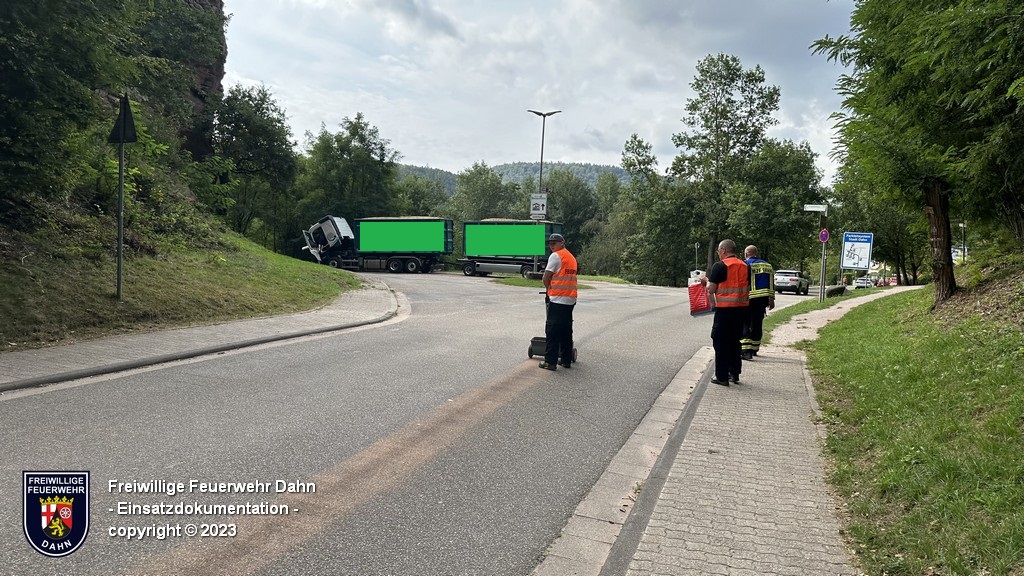 Zeitleich zum Kellerbrand in Hinterweidenthal forderte das Ordnungsamt der Verbandsgemeinde Dahn die Einheiten Dahn und Busenberg zu einer Ölspur an, die sich von Busenberg über die B 427 nach Dahn zog. Durch einen technischen Defekt an einem Gliederzug leckte die Dieselleitung der Zugmaschine, was sich während der Fahrt nicht bemerkbar machte. Erst kurz vor seinem Ziel fiel dem Fahrer anhaltender Dieselgeruch auf, weshalb er das Gefährt unmittelbar stoppte. Das Mehrzweckfahrzeug (MZF) sowie das Kleinalarmfahrzeug (KLAF) kümmerten sich um die Abarbeitung der Ölspur im Dahner Ortsbereich, die Einheit Busenberg wurde für das dortige Ortsgebiet alarmiert. Die Reinigung der B427 außerhalb der Ortschaften übernahm der Landesbetrieb Mobilität (LBM). Der ausgetretene Kraftstoff wurde gebunden, aufgenommen und entsorgt.