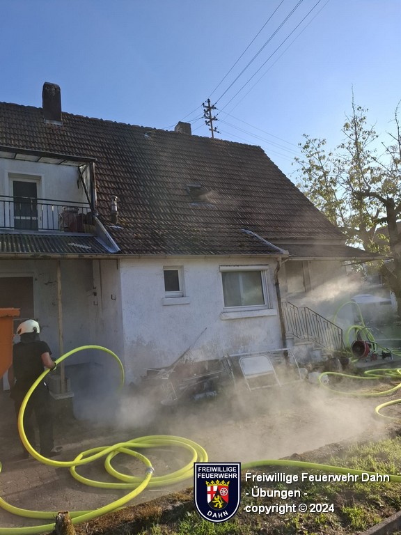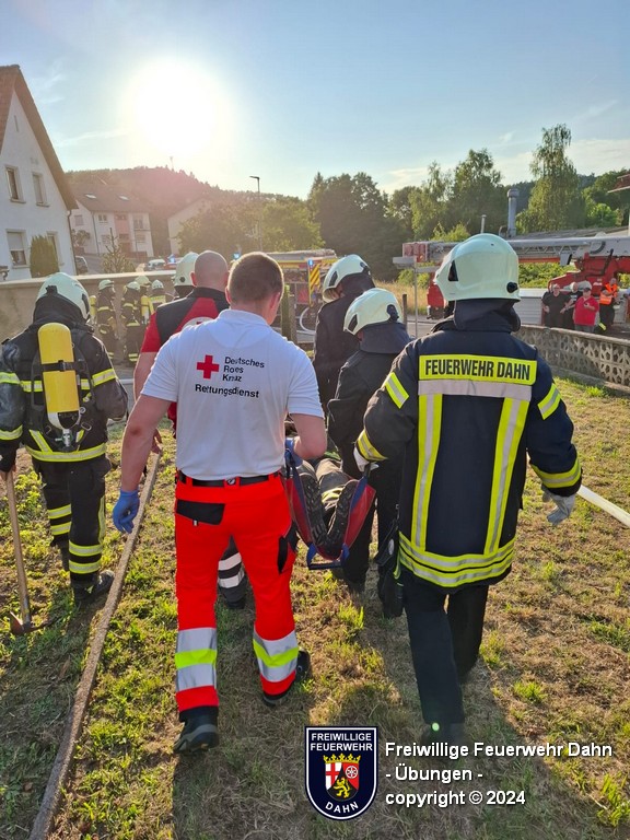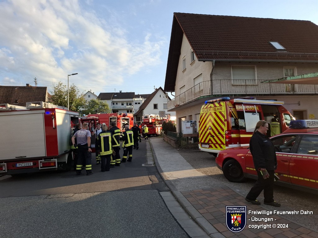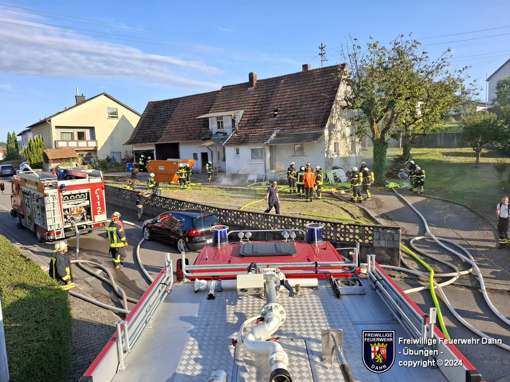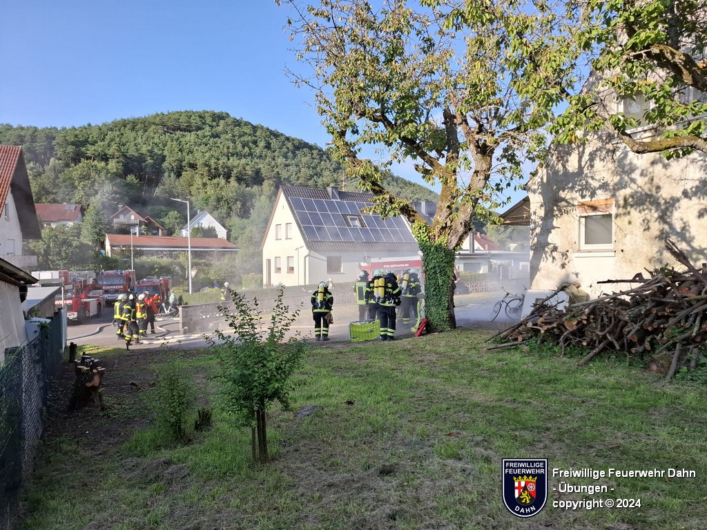 Am 18.07.2024 um 19:04 Uhr wurde die Dahner Wehr zusammen mit den Feuerwehren Busenberg, Schindhard, Erlenbach, Bruchweiler-Bärenbach und Bundenthal mit dem Stichwort "Gebäudebrand mit Menschenrettung" und der Zusatzinfo "Personen im Gebäude" nach Busenberg zur einer Realübung alarmiert. Die erste Erkundung durch örtliche Kräfte ergab, dass ein Einfamilienhaus stark verraucht war und mehrere Verletzte sowohl an Gebäudefenstern als auch im Hof auf Hilfe warteten.