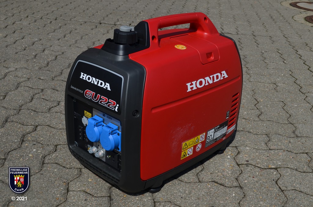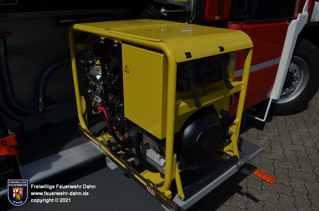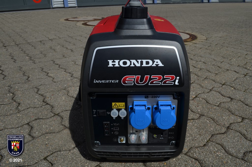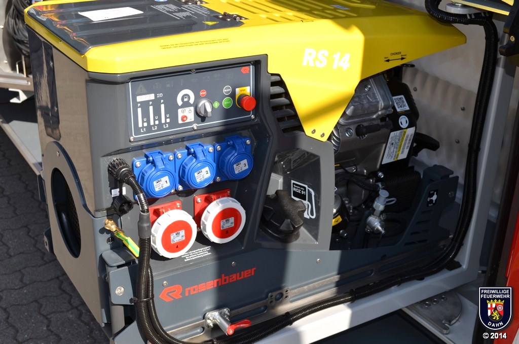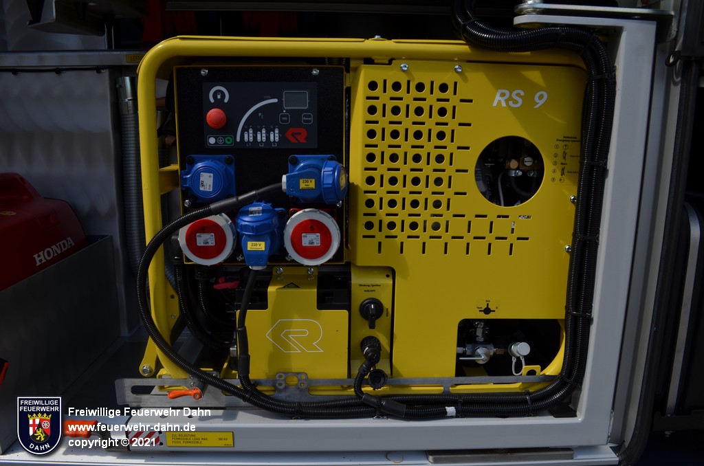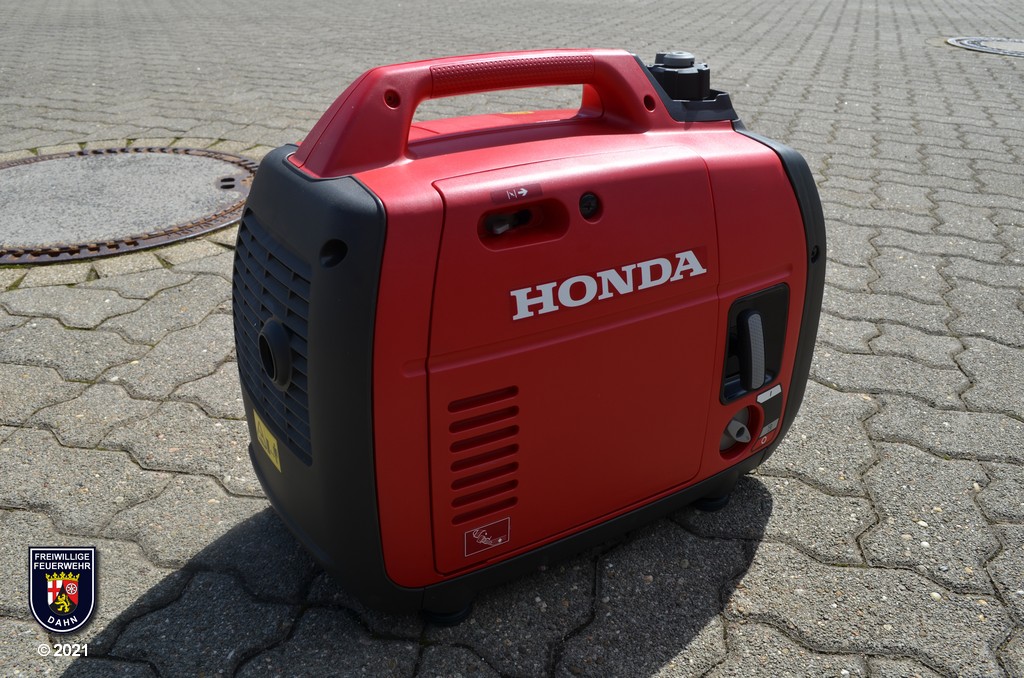 Darüber hinaus gibt es auf dem RW ein tragbares Honda Stromaggregat mit 2,2 kVA Leistung. Somit können sie stromsparenden LED-Strahler auch an abgelegenen Einsatzstellen eingesetzt werden, ohne das ein langes Stromkabel zu einem Einsatzfahrzeug verlegt werden muss.