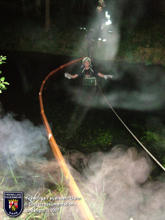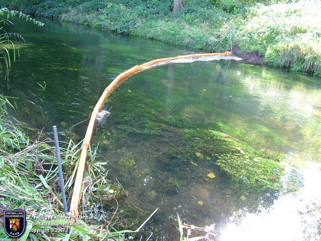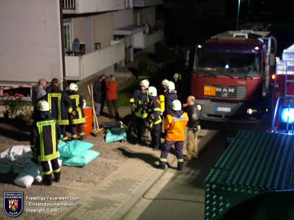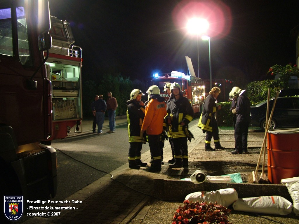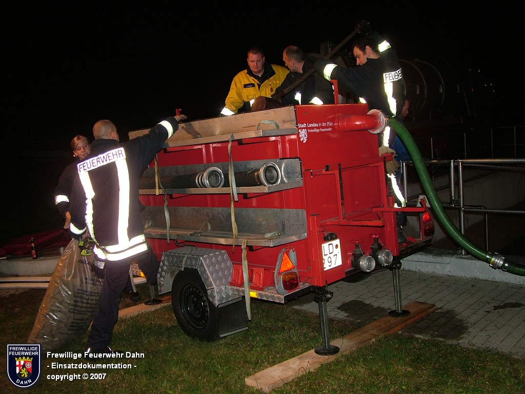 Während des im Feuerwehrhaus Dahn stattfindenden Dia-Vortrages von Mitsch Schreiner über sein Hilfsprojekt auf den Philippinen schlugen die Meldeempfänger der Angehörigen der Feuerwehr Dahn Alarm. Beim Befüllen eines Heizöltanks flossen aus bisher unbekannter Ursache über die Entlüftungseinrichtung auf dem Dach überm 2. OG eines Wohnhauses mehrere hundert Liter Heizöl auf das Dach und von dort über die Oberflächenentwässerung in die Kanalisation. Bei Ankunft der ersten Kräfte an der Einsatzstelle stand Öl sowohl im Tankraum als auch in der Dachrinne sowie auf dem Erdboden unterhalb der Dachrinne. Die Kontrolle der Kanalisation ergab, dass das Öl auch dort schon angelangt war.