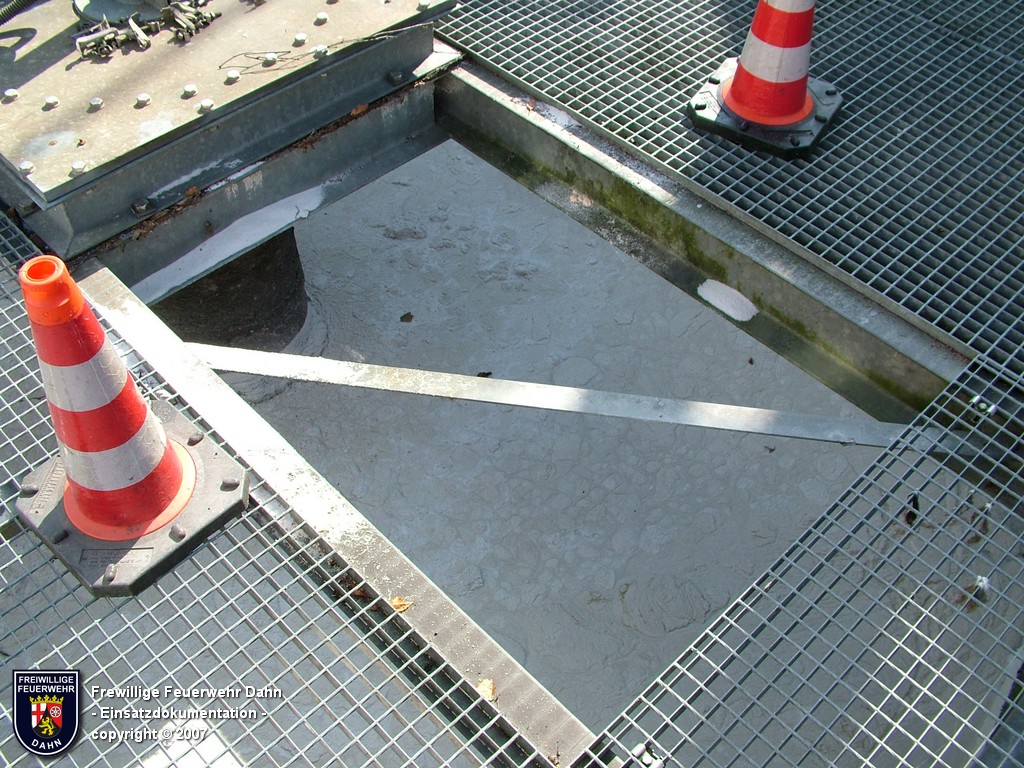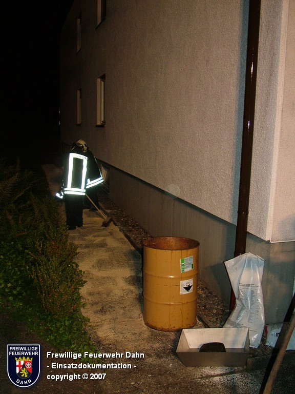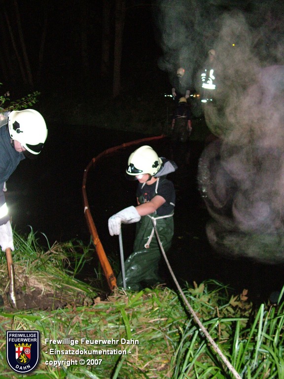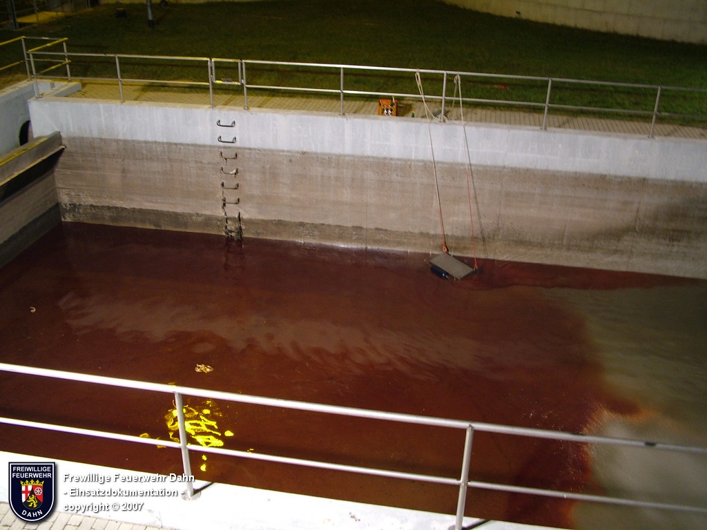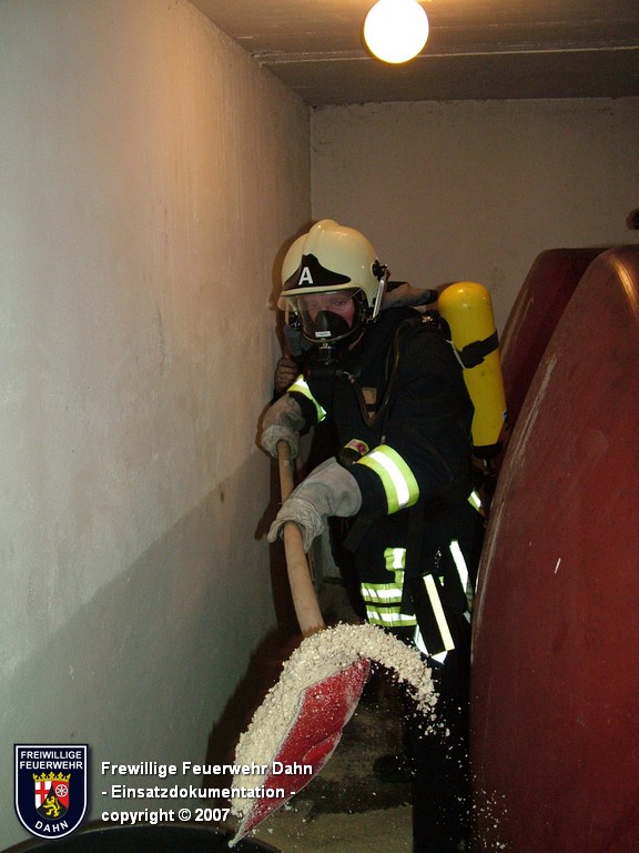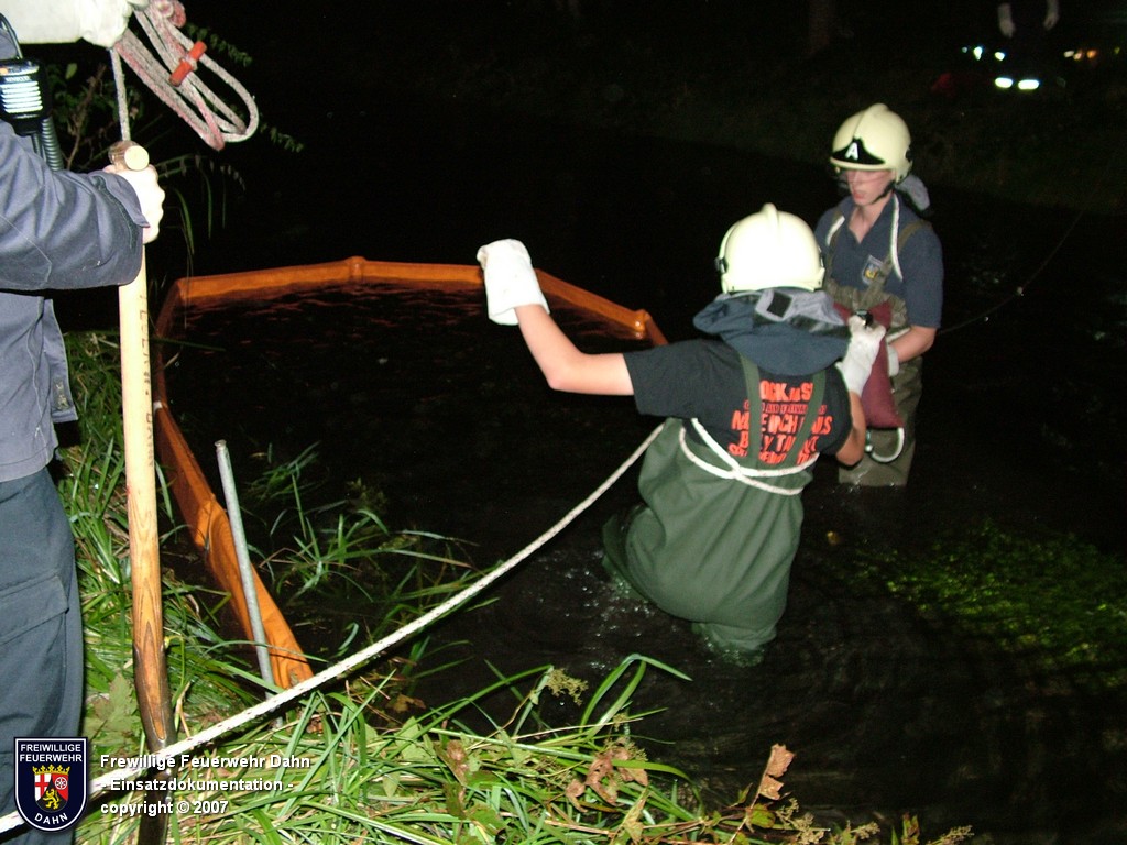 Während des im Feuerwehrhaus Dahn stattfindenden Dia-Vortrages von Mitsch Schreiner über sein Hilfsprojekt auf den Philippinen schlugen die Meldeempfänger der Angehörigen der Feuerwehr Dahn Alarm. Beim Befüllen eines Heizöltanks flossen aus bisher unbekannter Ursache über die Entlüftungseinrichtung auf dem Dach überm 2. OG eines Wohnhauses mehrere hundert Liter Heizöl auf das Dach und von dort über die Oberflächenentwässerung in die Kanalisation. Bei Ankunft der ersten Kräfte an der Einsatzstelle stand Öl sowohl im Tankraum als auch in der Dachrinne sowie auf dem Erdboden unterhalb der Dachrinne. Die Kontrolle der Kanalisation ergab, dass das Öl auch dort schon angelangt war.