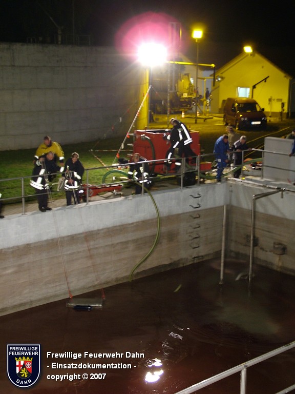 Durch den verständigten Bereitschaftsdienst der Klärwerke konnte in letzter Minute das in der zwei Kilometer entfernten Kläranlage bereits ankommende Öl-Abwasser-Gemisch in ein Auffangbecken umgeleitet werden. Die Einsatzkräfte der Feuerwehr Dahn errichteten mehrere Ölsperren in der Kanalisation, im Zulauf zur Kläranlage sowie auf der Wieslauter. Im Tankraum des betroffenen Gebäudes wurde das Öl unter Atemschutz mittels Bindemittel gebunden. Unterstützung erhielten die Dahner Floriansjünger von ihren Kameraden aus Erfweiler, dem Gefahrstoffzug des Landkreises Südwestpfalz, sowie der Feuerwehr Landau, die mit einem Ölsanimat anrückte. Hiermit wurde das auf dem Abwasser im Auffangbecken der Kläranlage Dahn schwimmende Öl abgesaugt und vom Wasser getrennt.