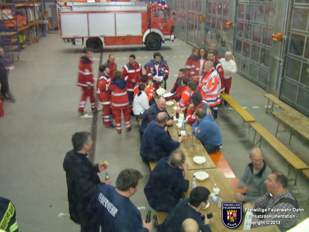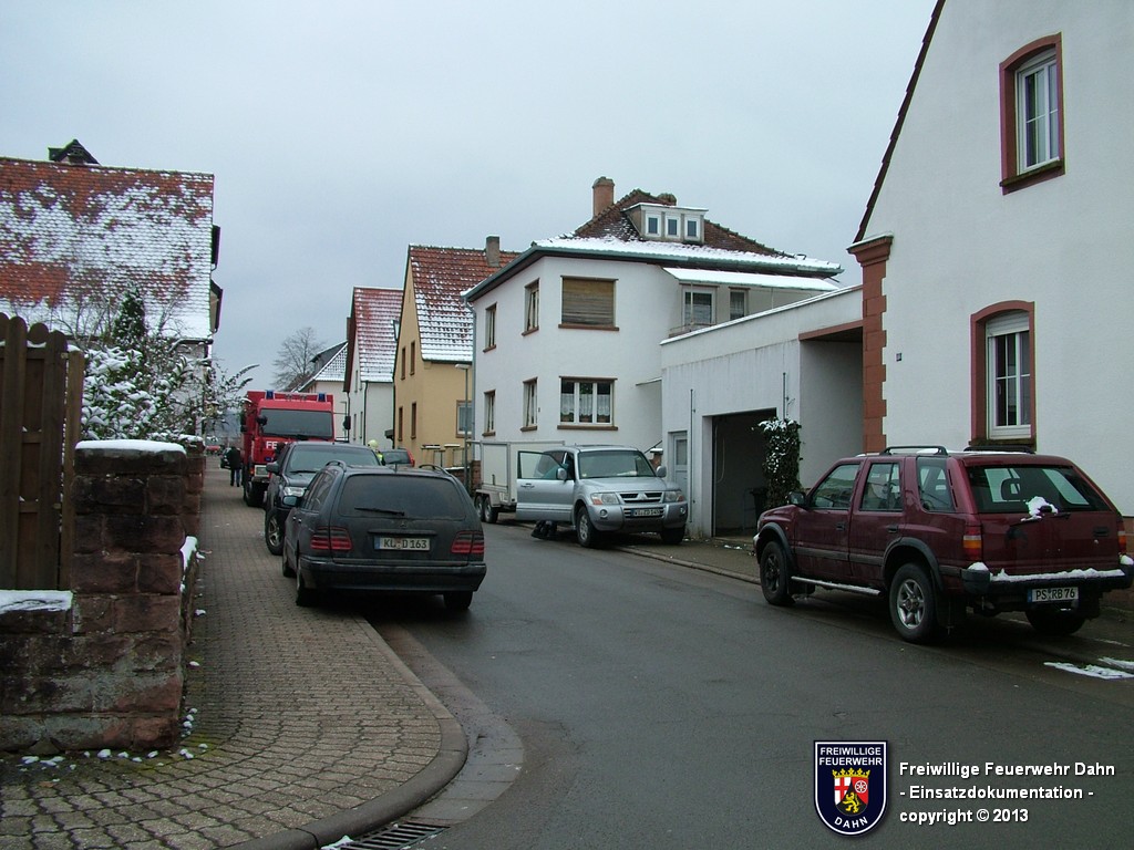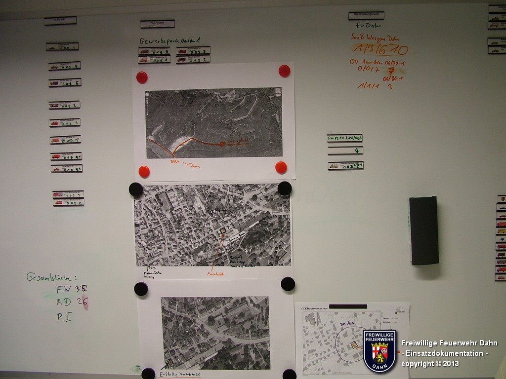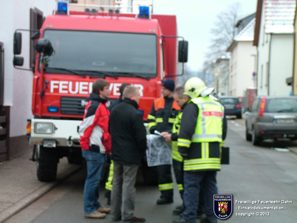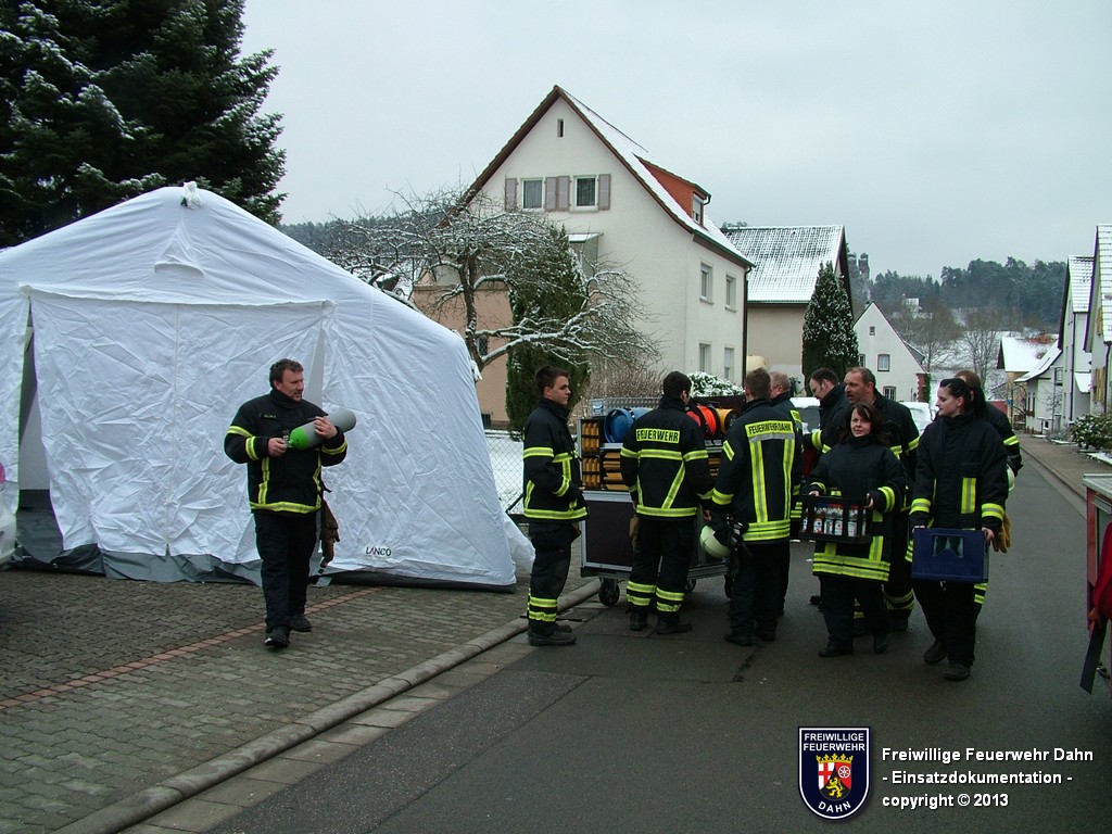 Bei einer Vorbesprechung im Feuerwehrgerätehaus wurden zunächst zwei Einsatzabschnitte gebildet: Absperrung/Brandbekämpfung sowie Evakuierung. Um die Brandbekämpfung bei einer eventuellen Explosion schnell einleiten zu können, fuhren LF 16 und DLK einen sicheren Bereich in relativer Nähe zum Einsatzobjekt an. Weitere Fahrzeuge aus Dahn, Erfweiler und Bruchweiler bezogen an den angrenzenden Straßenkreuzungen Stellung und sperrten das Gebiet ab. Die Kräfte des Abschnitts Evakuierung suchten in Abstimmung mit Ordnungsamt und Polizei die rund 20 Häuser auf, die in einem Umkreis von knapp 50 Meter geräumt werden sollten und informierten die Bewohner. Im Feuerwehrgerätehaus Dahn wurde ein Aufenthaltsraum für die Betroffenen hergerichtet und deren Verpflegung vorbereitet. Darüber hinaus stellte die Feuerwehr Bruchweiler mit ihrem MTW einen Fahrdienst zur Verfügung, um die nicht mobilen Bürger aus der Gefahrenzone zu bringen.