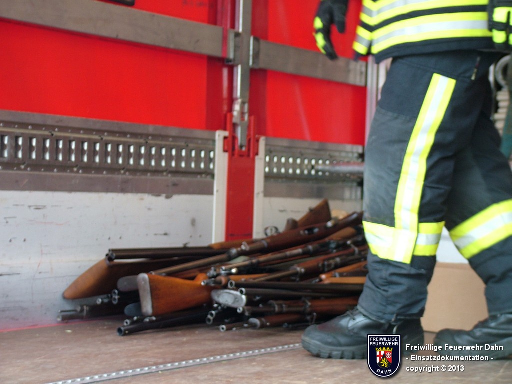 Nachdem die Absperrungen eingerichtet und die betroffenen Bürger das Gebiet verlassen hatten, unterstützten Feuerwehrkräfte die Polizei beim Heraustragen der aufgefundenen rund 90 Schusswaffen und der über 20.000 Schuss Munition aus dem Gebäude. Mit dem MZF wurden diese Gegenstände anschließend zu einem Polizeistandort verbracht.
