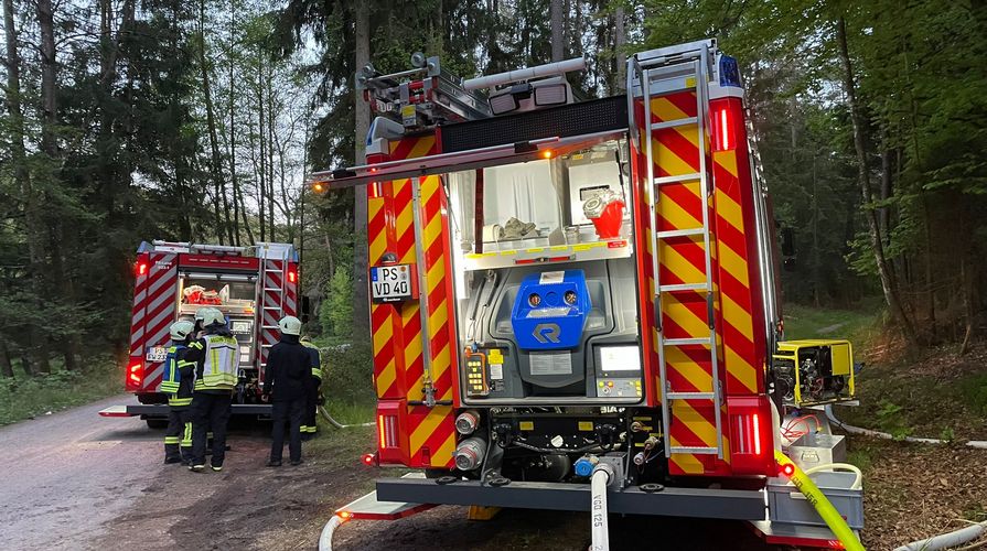 Die ersteintreffenden Kräfte erkundeten umfassend die Ausbreitung und Größe des Waldbrandes, um effizient die zur Verfügung stehenden Fahrzeuge einsetzen zu können. An der linken Flanke des Feuers wurde das Hilfeleistungslöschgruppenfahrzeug (HLF) 10 positioniert. Ein vor dem Fahrzeug aufgebauter Faltbehälter mit 5.000 Liter Wasser Fassungsvermögen wurde durch das Tanklöschfahrzeug (TLF) 16/45 aus Dahn und dem TLF 3000 der Feuerwehr Lemberg befüllt und diente als Puffer für die Löschwasserversorgung dieses Einsatzabschnittes. Die beiden Tanklöschfahrzeuge fuhren im Anschluss im Pendelverkehr zum nächstgelegenen Hydranten.