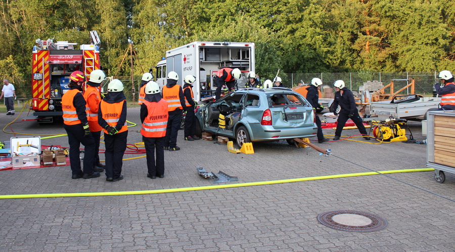 Am Freitagabend wurde bei hochsommerlichen Temperaturen die Zugübung zum Thema Verkehrsunfall durchgeführt. Als Übungsszenario wurde der seitliche Zusammenstoß zweier Pkw angenommen, infolgedessen mehrere Personen eingeklemmt wurden.