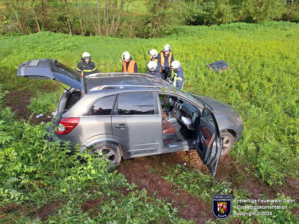 Am Sonntagmorgen kam es im Kreuzungsbereich der Erlenbacher Kreuzung zum Zusammenstoß zweier Pkw. Ein Pkw wurde hierbei von Straße in die tiefer gelegene Wiese geschleudert und blieb auf dem Dach liegen. Da eine Person im Fahrzeug eingeschlossen war wurde neben Rettungsdienst und Polizei auch die Feuerwehr alarmiert. Die Einsatzkräfte verschafften sich Zugang zu dem Pkw und sicherten ihn mittels des sogenannten Stabfast gegen ein unkontrolliertes Umfallen. Für die Befreiung der Person wurde eine "Große Seitenöffnung" geschaffen, es wurden also beide Türen der Fahrerseite mittels hydraulischen Gerät entfernt. Im Anschluss wurde sie auf einem Spineboard über die Heckklappe gerettet.