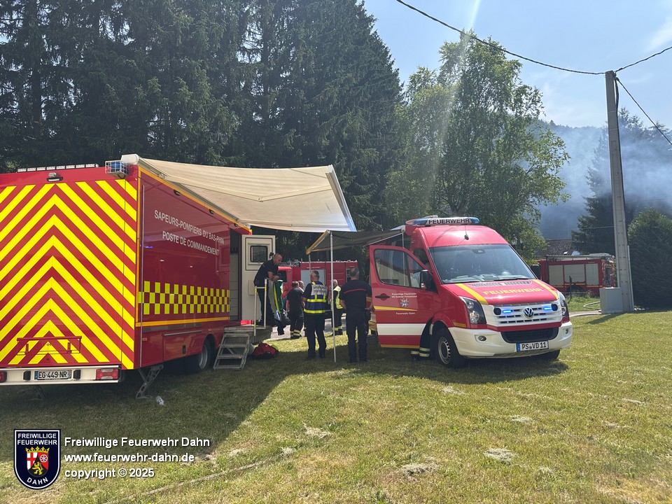 Die Kommunikation bei gemeinsamen Einsätzen wird durch einen Verbindungsoffizier unterstützt. Dabei handelt es sich um eine Führungskraft, die beide Sprachen fließend spricht. Die Dahner Fahrzeuge wurden aufgrund des Stichworts ausschließlich mit atemschutztauglichem Personal besetzt, sodass insgesamt 10 Atemschutzgeräteträger (AGT) aus Dahn zur Verfügung gestellt werden konnten. Die Löschwasserversorgung vor Ort gestaltete sich schwierig, weshalb die Kräfte aus der Verbandsgemeinde Dahner Felsenland bei der Wasserentnahme aus einem offenen Gewässer unterstützten und zwei separate Leitungen zur Einsatzstelle verlegten.