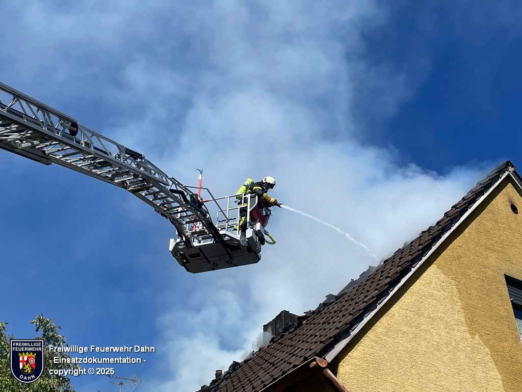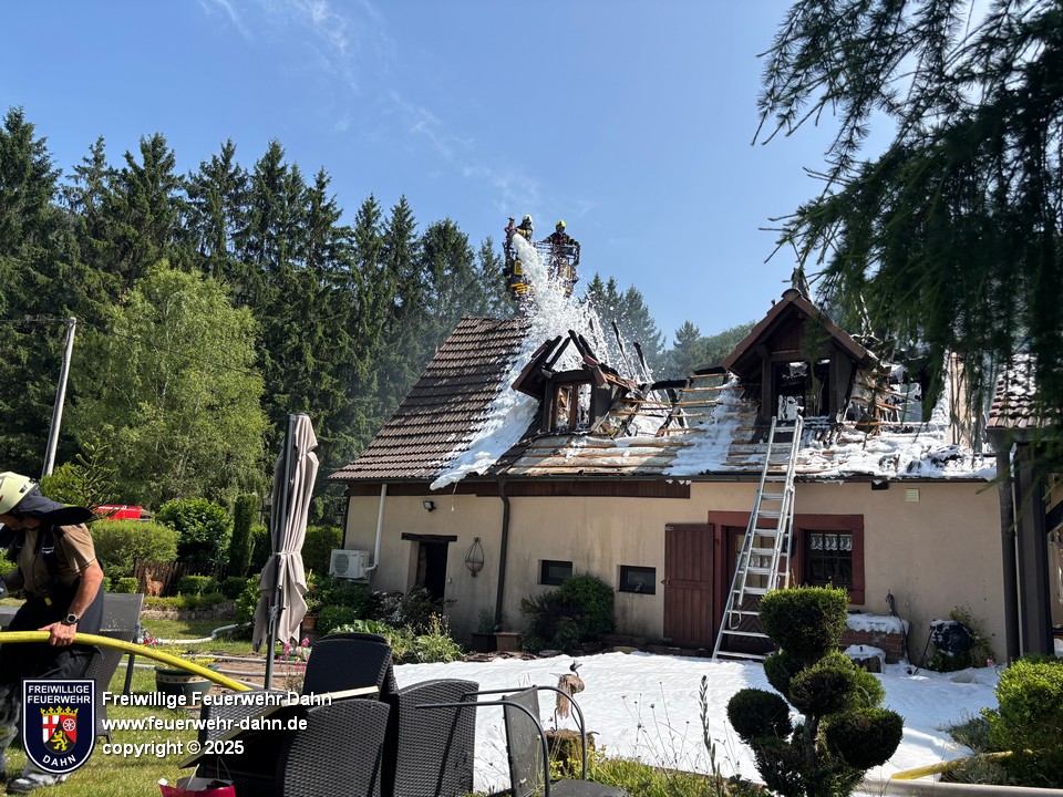Am Mittag wurden mehrere Feuerwehren mit dem Stichwort „Wohnungsbrand Busenberg“ alarmiert. Bereits auf der Anfahrt der Einsatzkräfte wurde das Stichwort aufgrund der Vielzahl der Notrufe und der schnellen Brandausbreitung auf „Gebäudebrand“ erhöht. Die ersteintreffende Ortswehr stellte eine in Vollbrand stehende Terrasse fest, dessen Flammen sich bereits in das komplette Dachgeschoß des Einfamilienhauses ausgebreitet hatten. Unter schwerem Atemschutz und mithilfe von Steckleitern wurden die offenen Flammen mit mehreren Strahlrohren bekämpft, sodass die Brandausbreitung auf ein Nachbarhaus verhindert werden konnte. Zwei Bewohner, die mit einem Gartenschlauch erste Löschversuche unternahmen und im Gebäudeinneren Brandrauch einatmeten, wurden vom Rettungsdienst zur Untersuchung in ein Krankenhaus transportiert. Sie wurden am selben Abend entlassen und blieben unverletzt.
