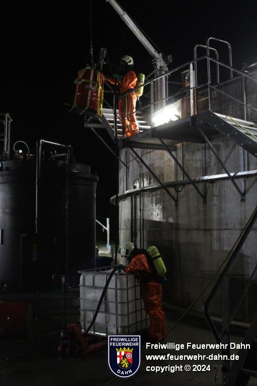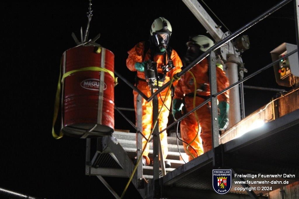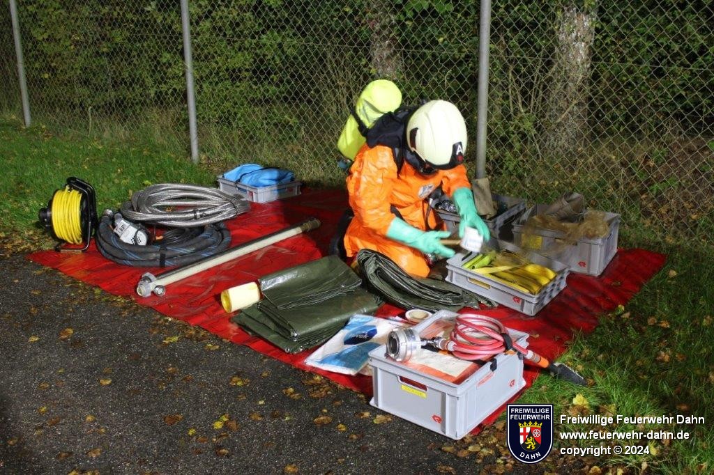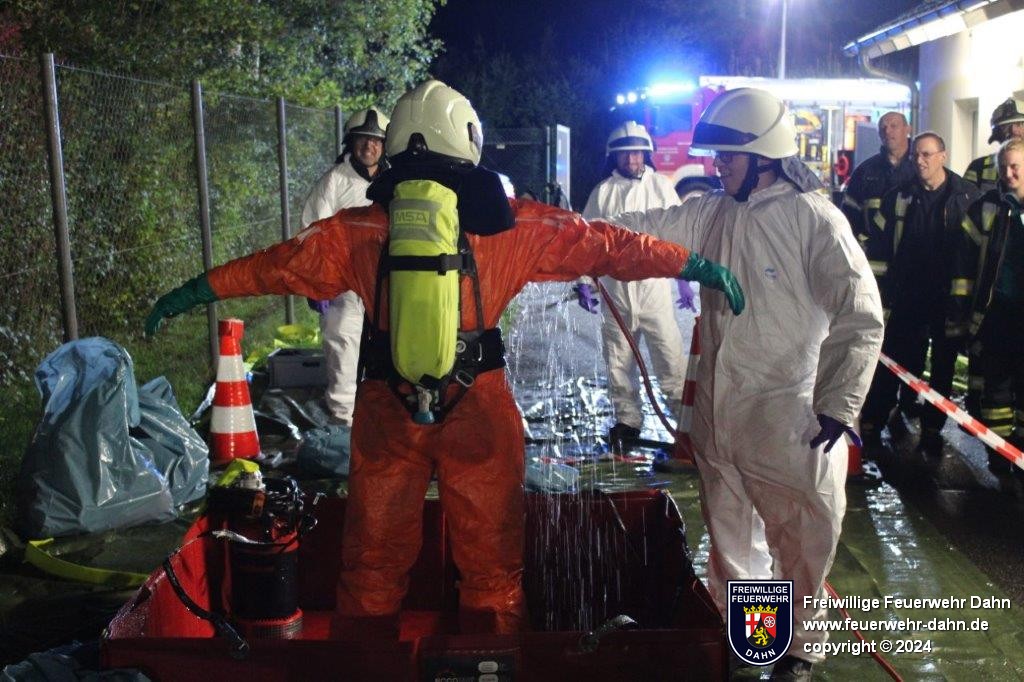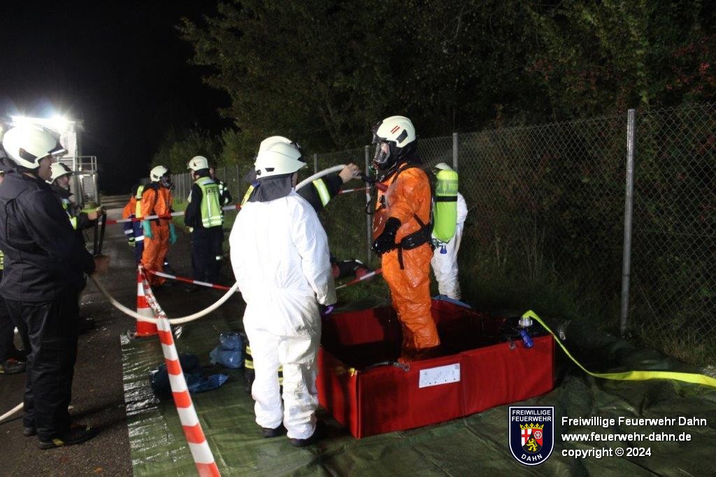 In den vergangenen zwei Wochen wurden jeweils Zugübungen durchgeführt. Am 04.10.2024 wurde ein Gefahrstoffunfall an der Kläranlage Dahn angenommen. Hier wurde simuliert, dass Arbeiter beim Verladen eines Gefahrstofffasses verunfallten. Durch eine Leckage an dem Fass liefen zudem Gefahrstoffe aus und breiteten sich aus. Die ersten eintreffenden Kräfte verschafften sich aus sicherer Entfernung einen Überblick über die Lage. Im Anschluss rettete der Angriffstrupp unter schwerem Atemschutz zwei verletzte Arbeiter aus dem Gefahrenbereich. Hiernach rüsteten sie sich mit Chemikalienschutzanzügen aus und dichteten die Leckage im Fass ab. Die gefährliche Flüssigkeit wurde anschließend mittels der Gefahrstoffpumpe des Rüstwagens in einen IBC-Behälter umgepumpt.