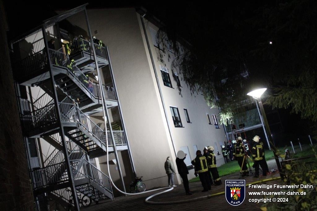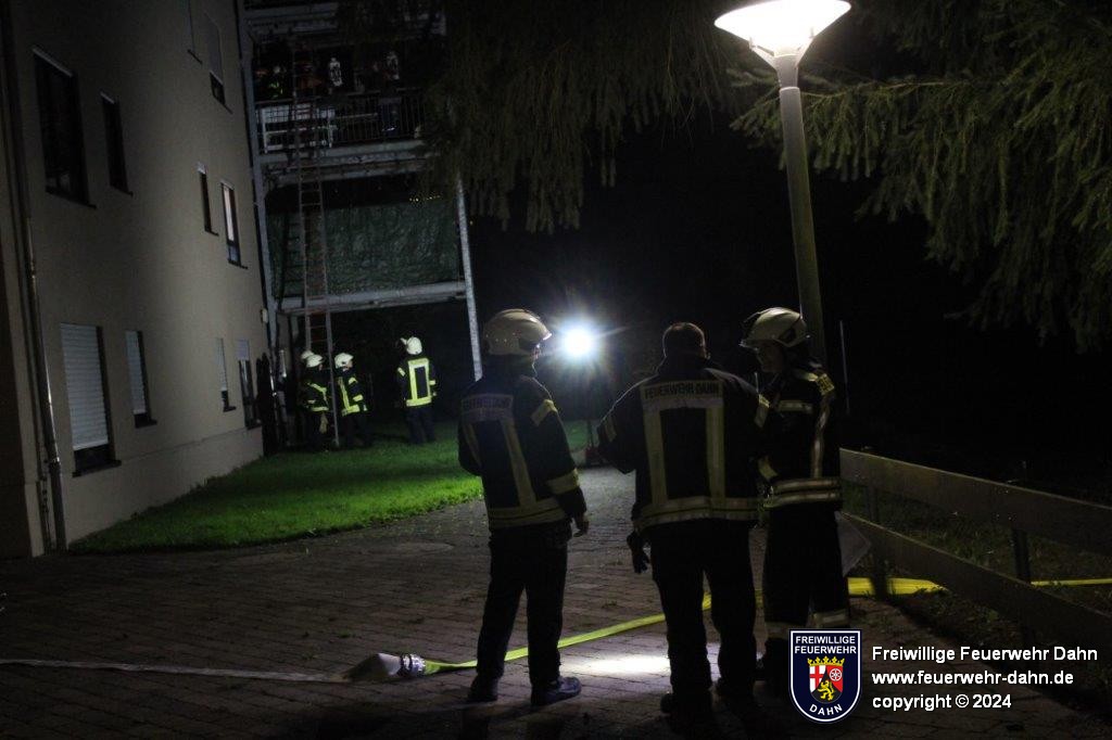 In der darauffolgenden Woche am 11.10.2024 wurde eine Zugübung in einer Dahner Sozialeinrichtung durchgeführt. Angenommen wurde hier der Brand in einem Bewohnerzimmer. Während des Aufbaus des Löschangriffes wurde der betroffene Gebäudeabschnitt durch das Personal der Einrichtung vorbildlich geräumt, sodass der Angriffstrupp unter schwerem Atemschutz zur Personensuche und Brandbekämpfung ins 2. OG vorgehen konnte. Weitere Einsatzkräfte retteten mittels Steckleiterteilen mehrere Personen, die sich auf einen Balkon geflüchtet hatten.